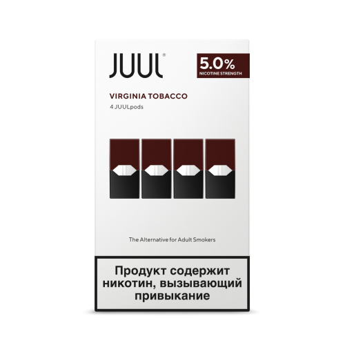 Картриджи JUUL Табак Вирджиния — со вкусом табака сорта Вирджинии. Один под (картридж) расчитан на ~200 затяжек и эквивалентен одной пачке сигарет. Поды (картриджи) доступны в упаковках по 2 и 4шт., крепость никотина составляет 59 мг/мл.